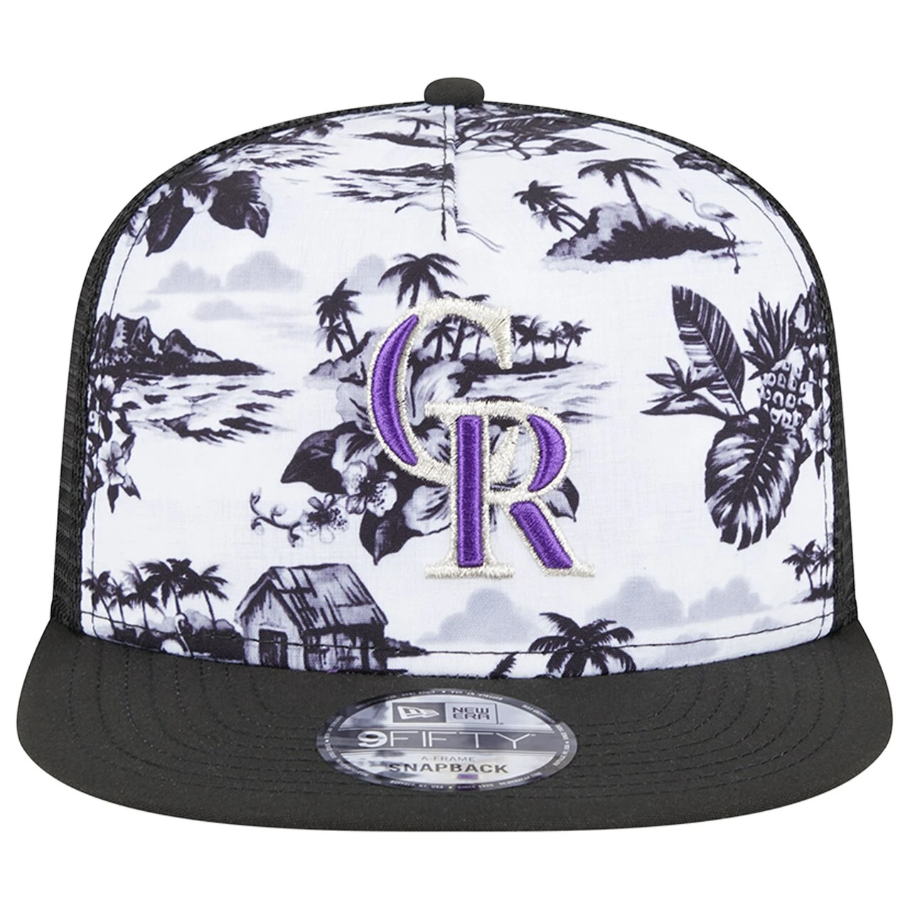 Kick back and relax in this Colorado Rockies Vacay 2.0 A-Frame 9FIFTY cap from New Era. This trucker hat features a fun and calming pattern of palm trees, the beach and some flamingos with the Colorado Rockies logo embroidered on top. The snapback construction will allow you to choose your comfort level and will help take your cares away.